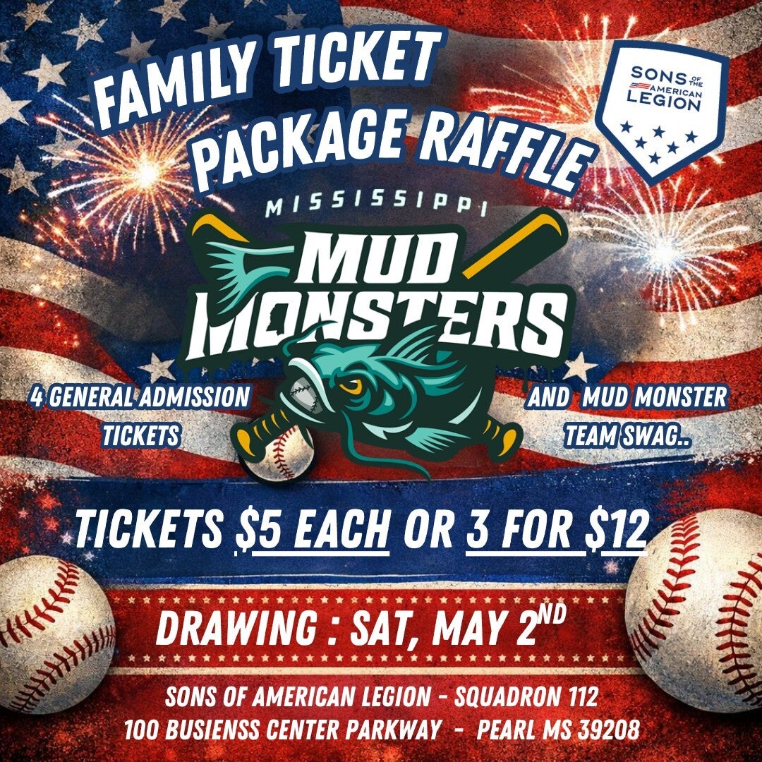 Sons of the American Legion Squadron 112 is stepping up to the plate with our Mississippi Mud Monsters Family Package Raffle that includes 4 game tickets and official Mud Monsters swag, including a t-shirt, hats, and backpacks. Game tickets can be used any time during the regular season (except the 4th of July).
